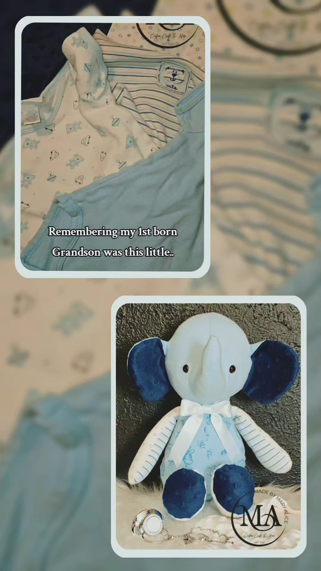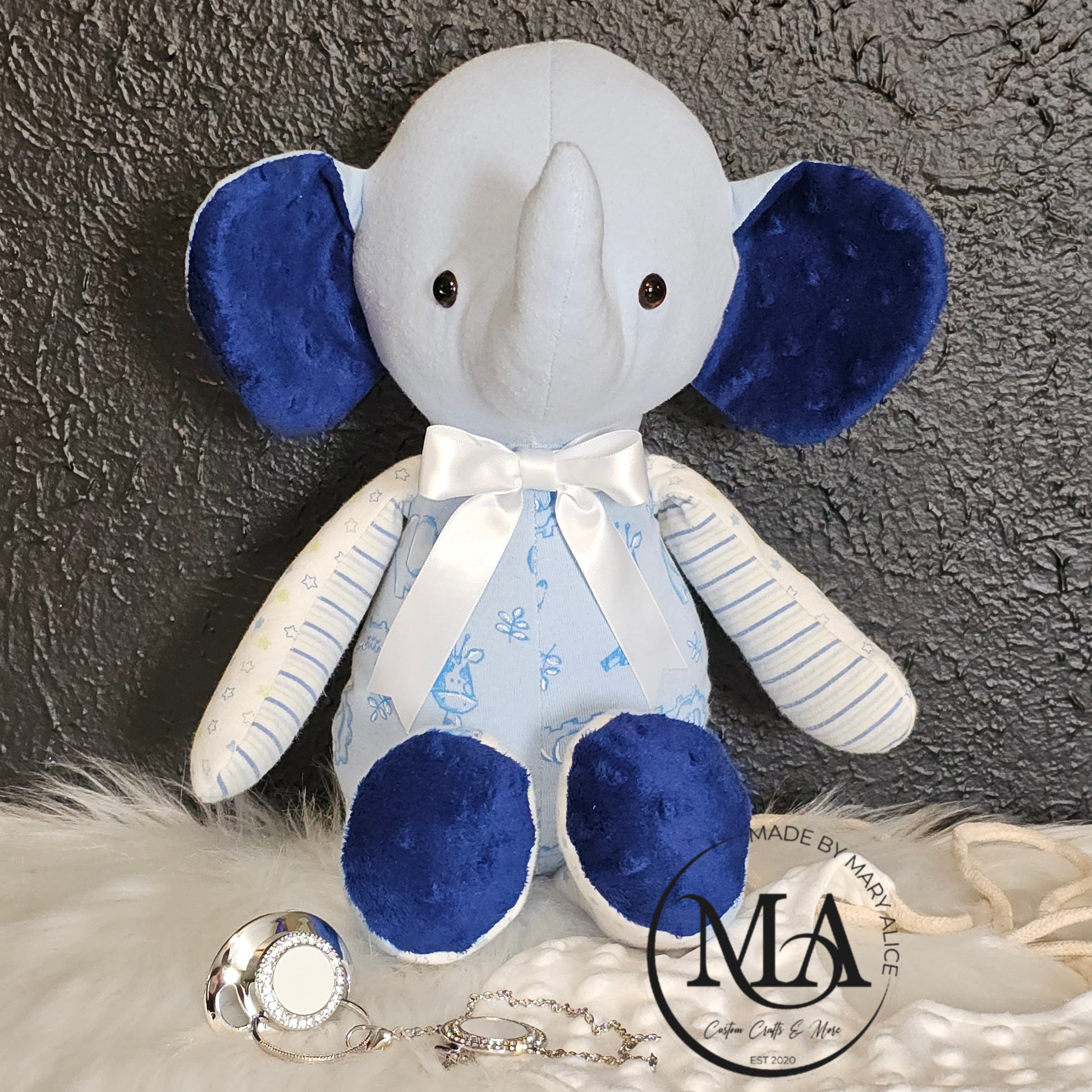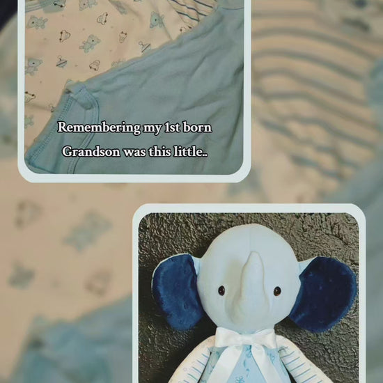 Preserve your child's precious memories with our Elephant Keepsake. Made from a minimum of 8 (at least 3-6 months) of their cherished garments or baby blankets. This elephant keepsake is the perfect way to hold onto special moments. Simply provide the garments and we'll do the rest.