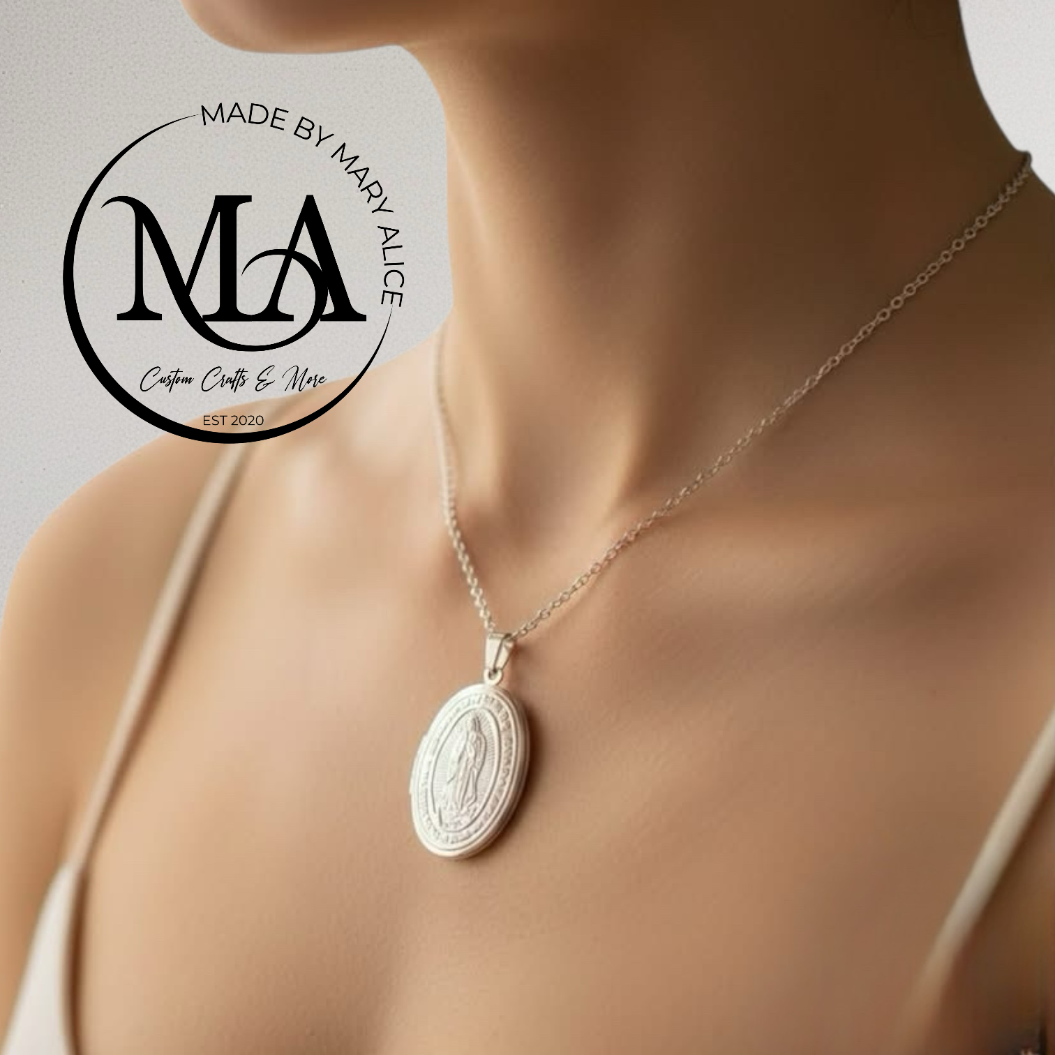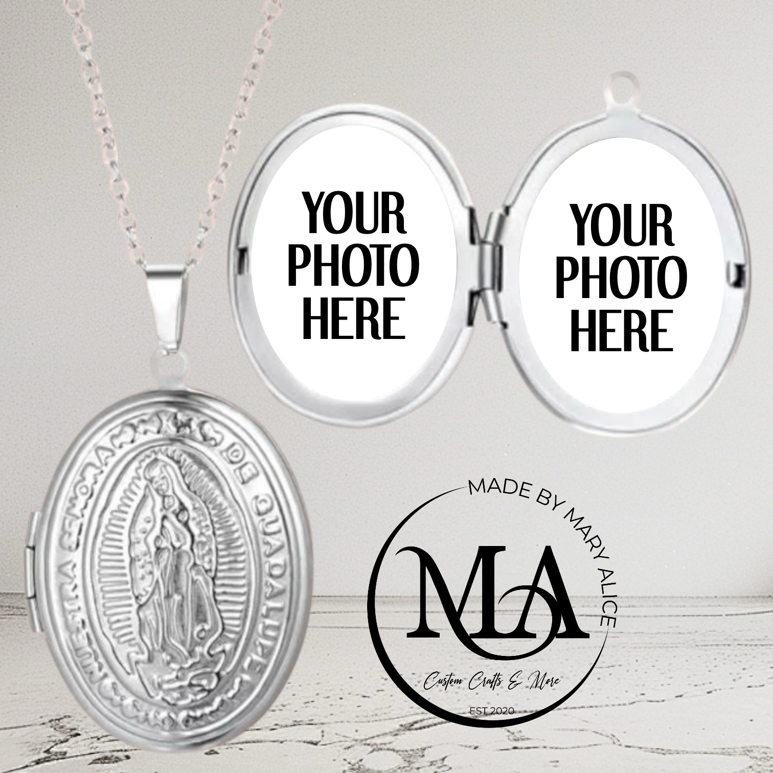 Elevate your style and keep loved ones close to your heart with the Virgin Mary Locket. Made of stainless steel, this locket is designed to last and hold precious memories. Personalize it with two images of your choice. A timeless accessory that embraces beauty and significance.